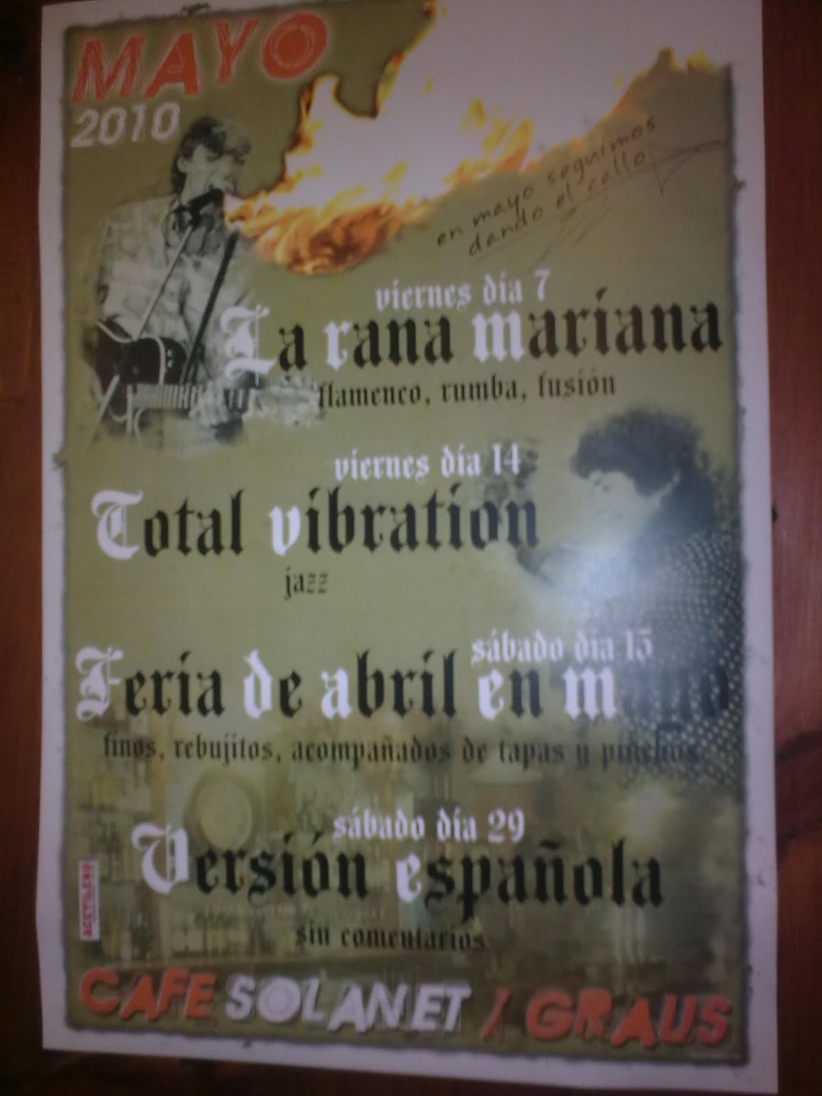 Una vez más el grupo de versiones pop en castellano, Versión Española, actuará el próximo 29 de mayo de 2010 en el Café Solanet de Graus. El concierto promete ser animado, y con buen ambiente, ya que ese día se celebran en Graus varios acontecimientos sociales, como por ejemplo, la marcha cicloturista clásicos de la Ribagorza, por lo que se espera un gran ambiente en Café Solanet.